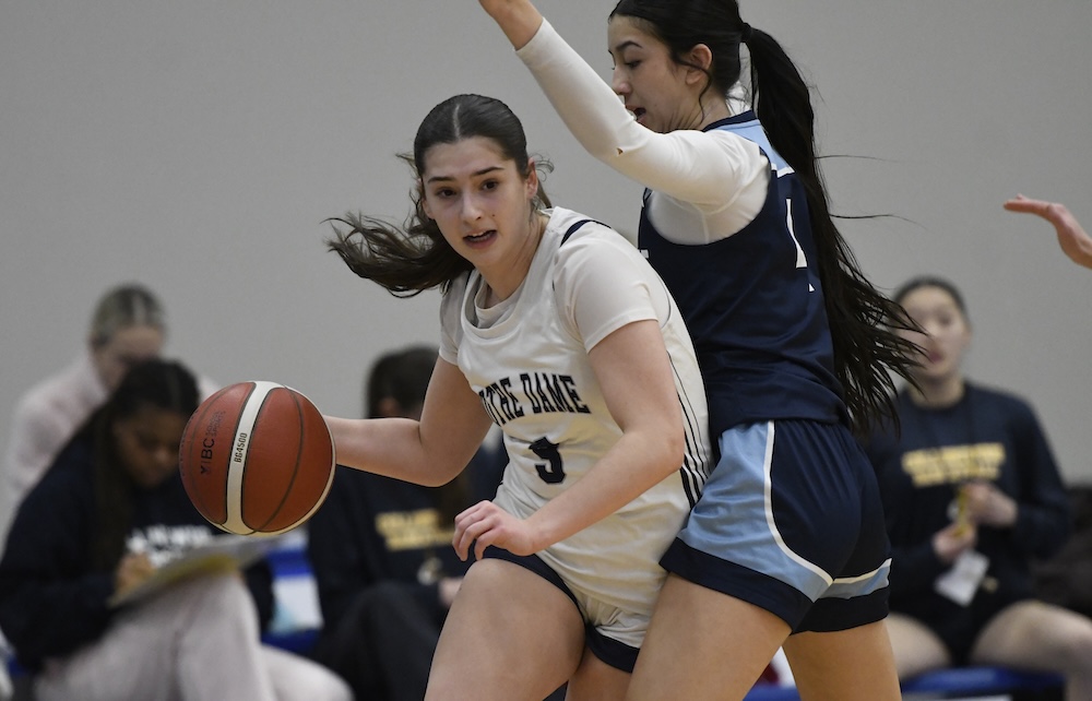 LANGLEY — Continuing with opening day action at the B.C. senior girls’ Double-A provincial championships, the fourth-ranked Notre Dame Jugglers battled against the 13th-seeded Westsyde Whundas — and it had a dramatic finish. A gritty match filled with offence, both sides were neck and neck until the second half, where Westyde began pulling away. However, Notre Dame fought hard and went on an emphatic run to make it a one-possession nailbiter, but ultimately fell short, 75-71.
