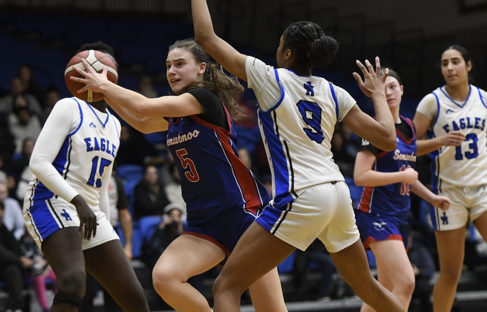 Semiahmoo’s ensuing possession was a bit of a mess; with the shot clock running down, the ball found its way to Claypool on the left wing with her back to the hoop, under heavy pressure from Nevaeh Kong. She spun to the middle of the floor and hoisted the only shot she could, given the shot-clock constraints and Kong’s suffocating defence – a one-legged, high-arcing fadeaway from beyond the arc. It hit the back rim, bounced high in the air, rattled around for a moment, and fell through.