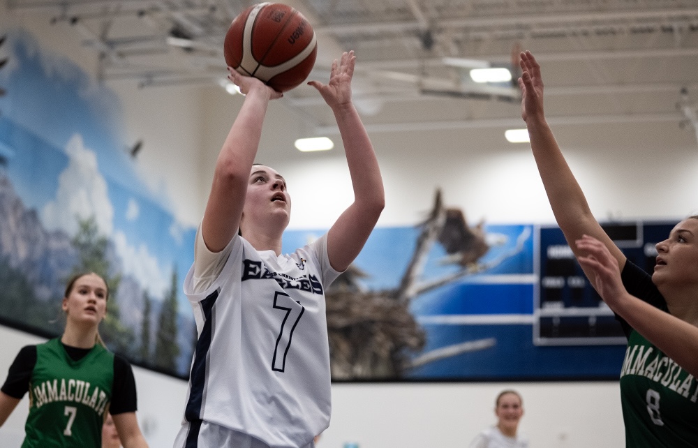Both teams showed good ball movement following the opening tip, which led to a wide-open corner three-pointer chance for Mustangs’ sophomore guard Sloane Fuglestveit, who didn’t hesitate and knocked it down to open the game’s scoring. From there, the Eagles turned on the jets. After Hooft scored a nothing-but-net elbow jumper, she followed up with an emphatic block on defence that turned into another two points in transition. This was the beginning of an 11-0 run for the Eagles, who then carried that momentum on both ends of the floor through the rest of the quarter, ending the frame with some breathing room, leading 19-7.