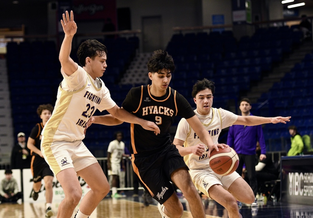 The Hyacks knocked the Irish back on their heels right out of the gate, scoring the first 10 points of the game with 6-foot-7 Grade 11 centre Djordje Komar and senior guard Kaman Kaila doing much of the damage.