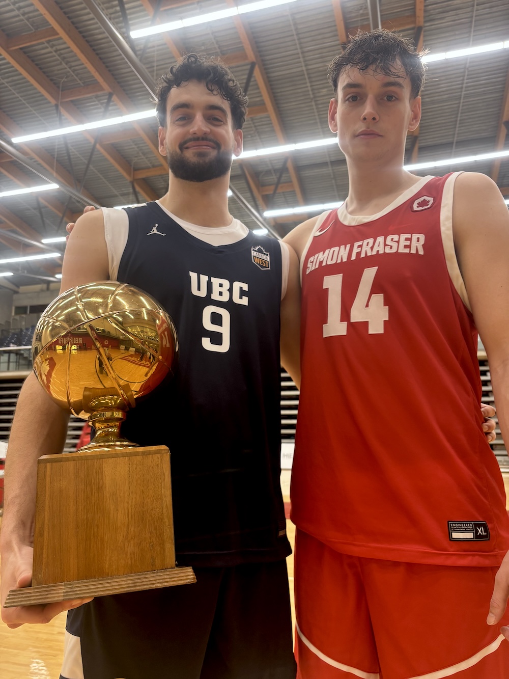 The elder Maric brother held the trophy above his head during UBC’s post-game celebration and later stood front and centre with the trophy in his arms as the team’s winning photo was taken. Later, he was asked light-heartedly if he would be figuratively holding the win and the bragging rights which accompany it, over his little brother’s head?