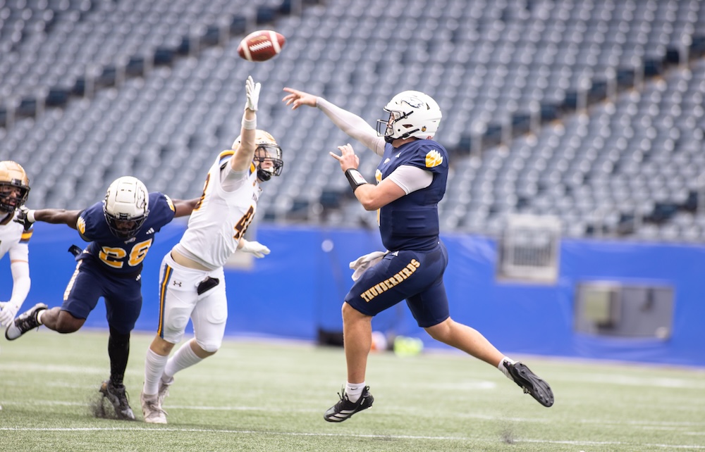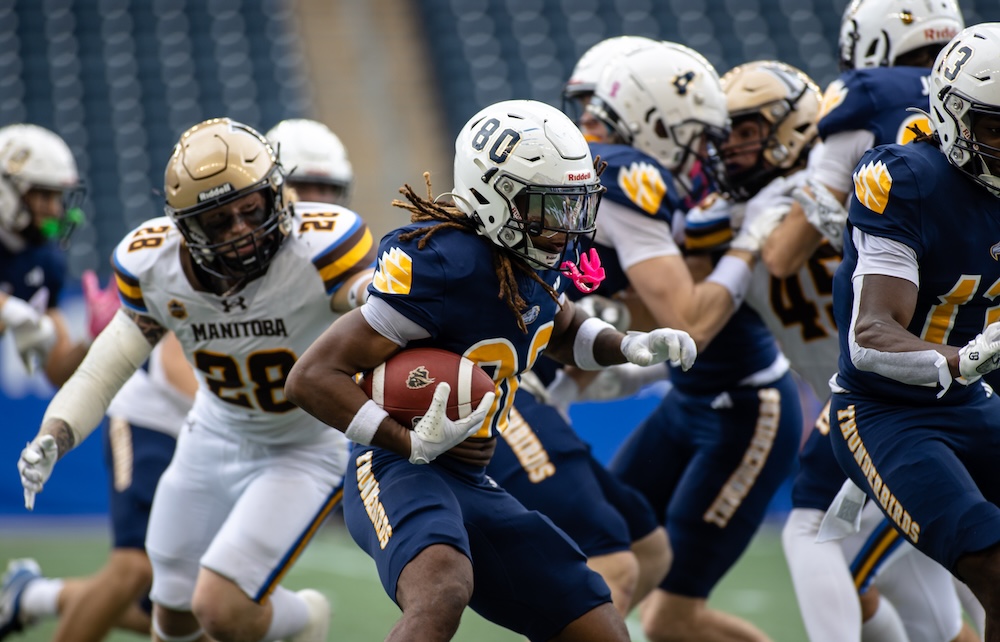 Manitoba quarterback Jackson Tachinski, who wound up rushing for three majors on the day, led his team on a 90-yard drive he capped himself from two yards out. Also a huge part of the drive: A 43-yard completion to receiver Nathan Udoh for a 35-31 lead.