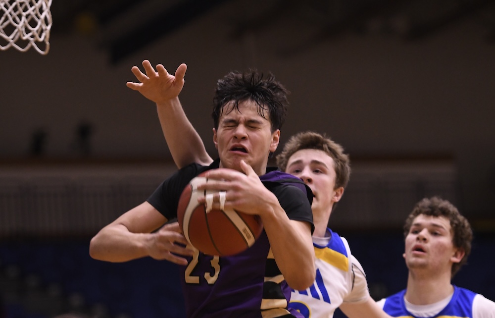 After Vancouver College pulls to within 63-62, he stays busy in the paint, chasing down a long rebound off the offensive glass to save possession.